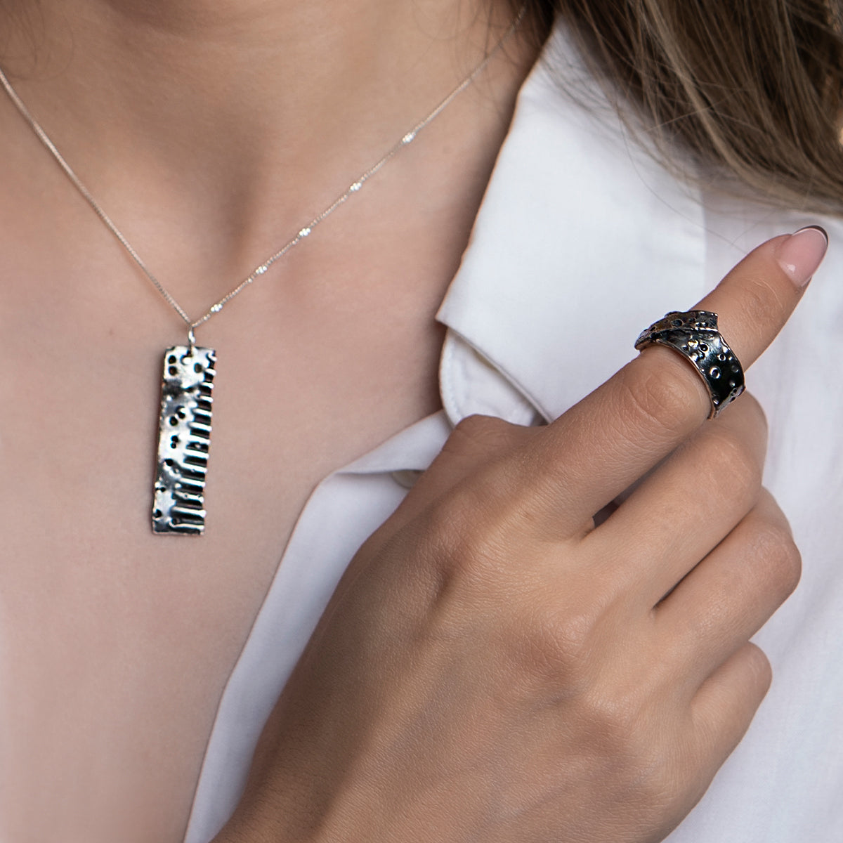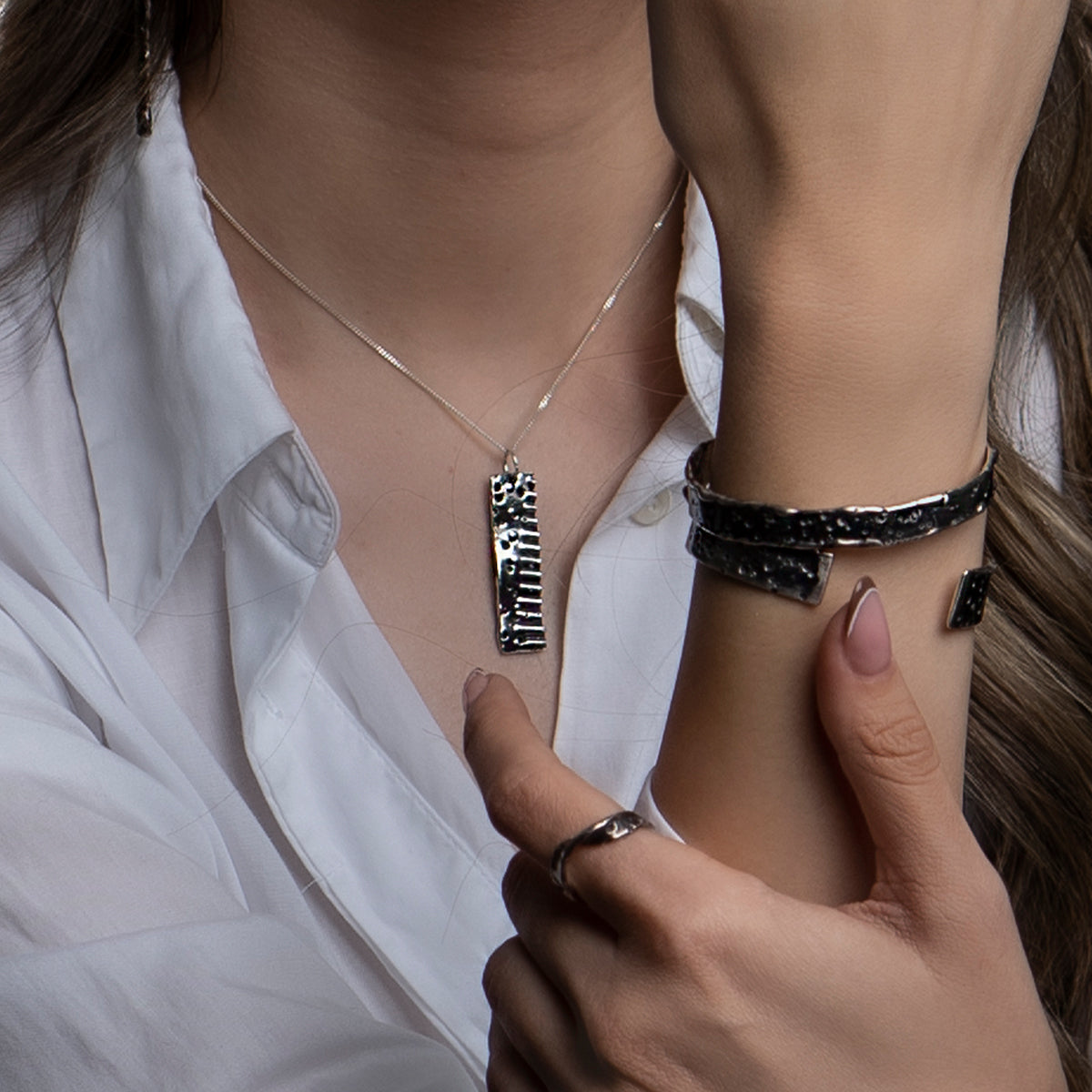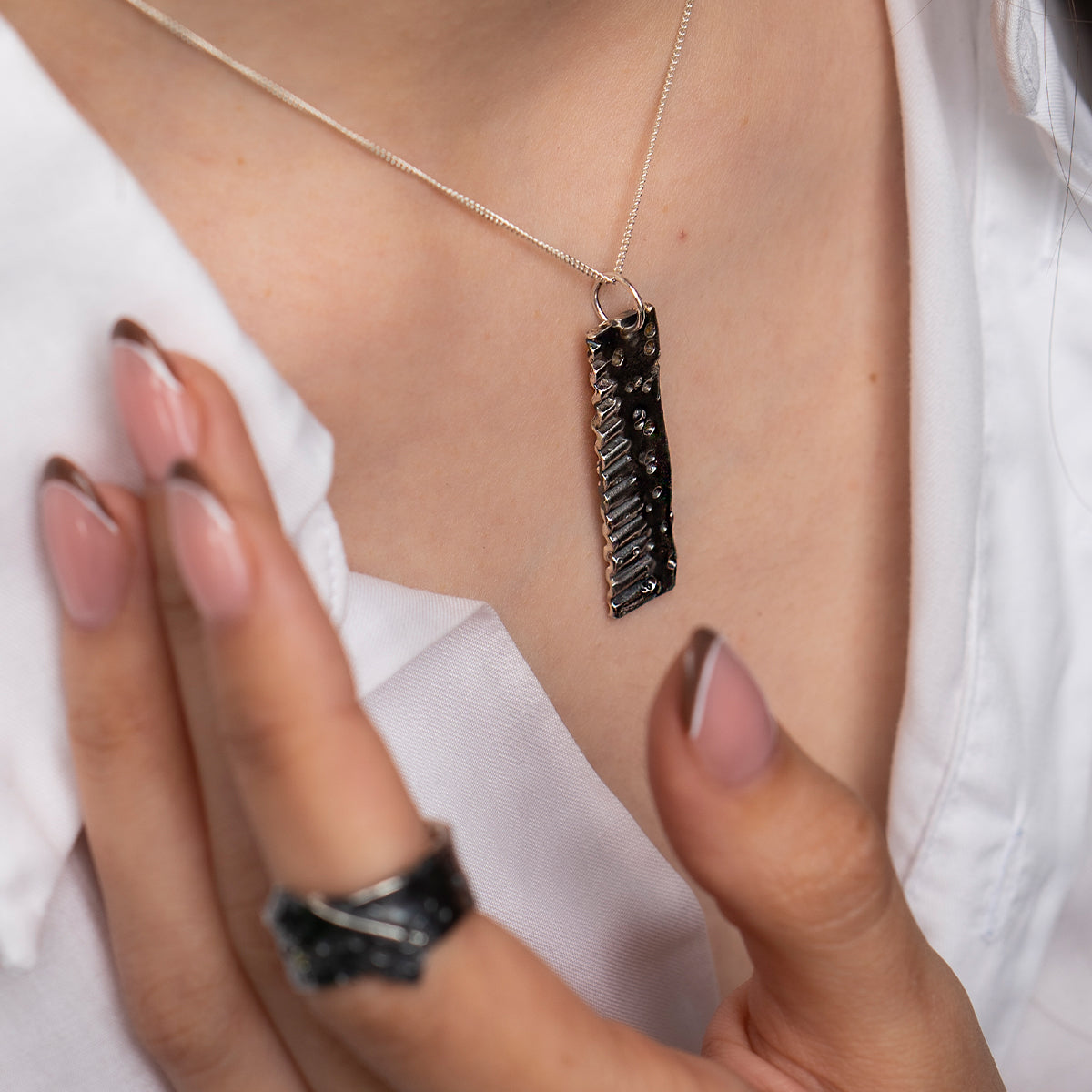 Acest colier din argint face parte din colecția Sensations și este lucrat manual. Forma unică a acestei bijuterii și patina argintului îți amintesc de frumusețea care se regăsește în imperfecțiune și autenticitate.O bijuterie minimalistă care te face să te bucuri de emoția simplității.